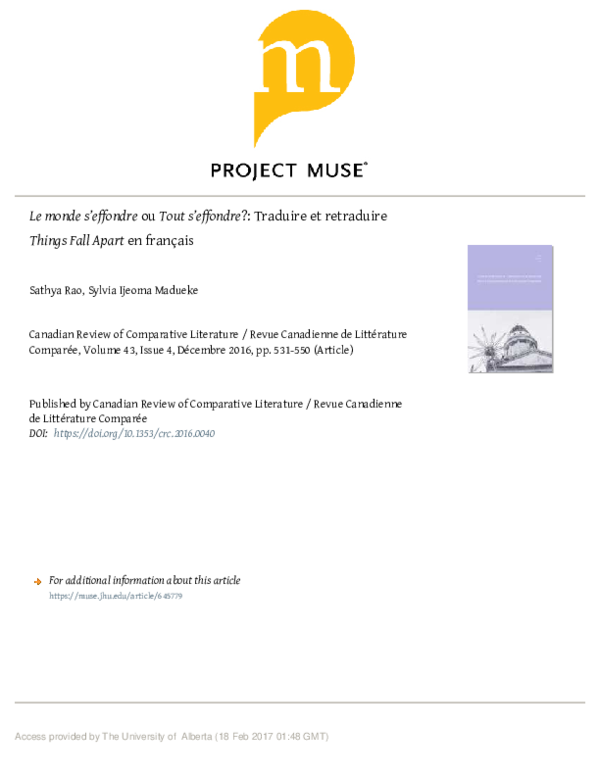 Pdf Le Monde S Effondre Ou Tout S Effondre Traduire Et Retraduire Things Fall Apart En Francais Sathya Rao And Ijeoma Sylvia Academia Edu
